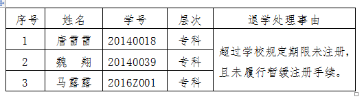 根据beat365英国官网网站beat365英国官网网站《关于成人高等教育学生学籍管理规定(修订)》第九条、三十一条相关规定,经学校研究决定,给予唐雷雷等3名学生退学处理。具体名单及处理事由如下:
