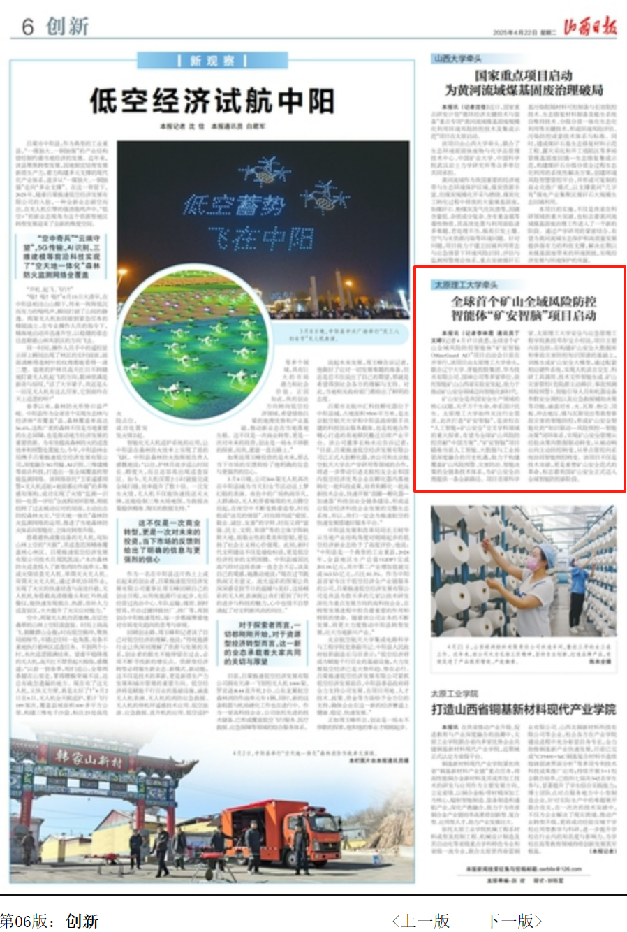 4月22日,《山西日报》以《3044am永利集团3044noc牵头:全球首个矿山全域风险防控智能体“矿安智脑”项目启动》为题对永利集团官网全球首个“矿安智脑”项目启动会进行报道。现将全文转载如下。